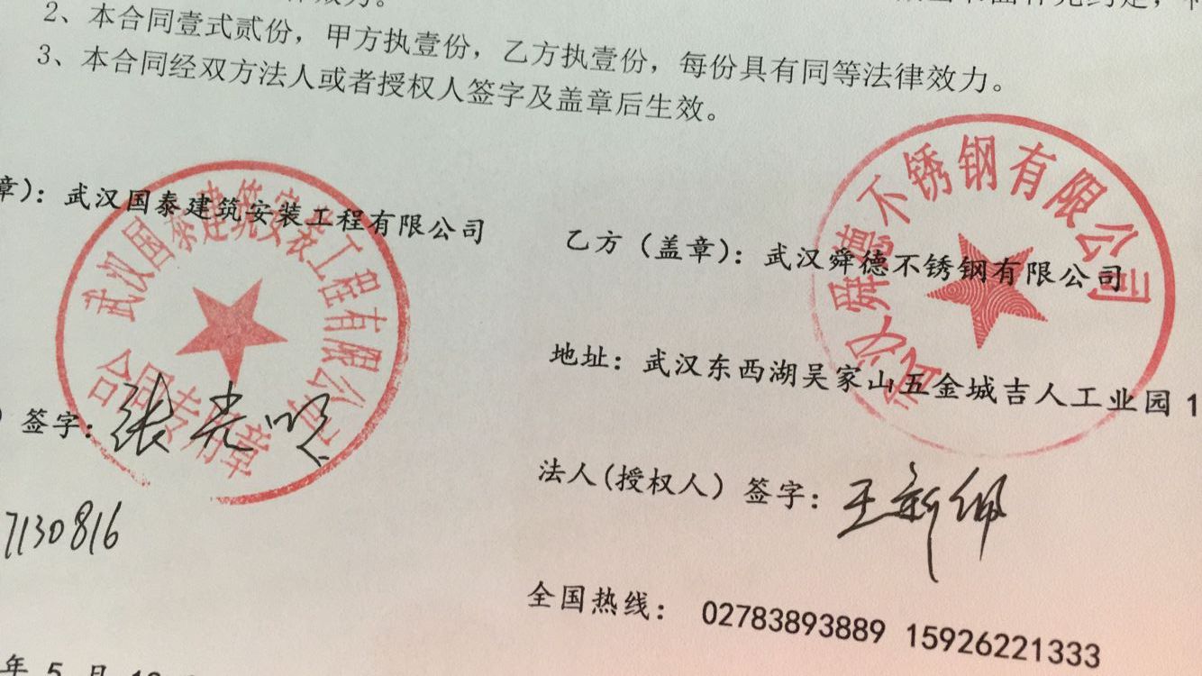 武漢國泰建筑安裝工程有限公司和我公司合作不銹鋼水箱,合同已貼出。